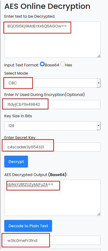 Now we have all the required material to decrypt ArkSvc password. Next, we will use an online tool to decrypt the password. To do so here’s the link. Here we will supply the hash in entering text which we found in Audit.db and select CBC mode and enter AES IV found in CascCrypto.dll and then enter the secret key found CascAudit.exe.