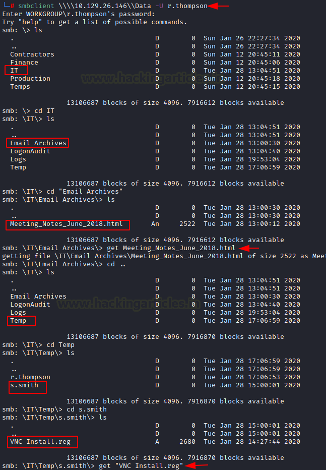smbclient \\\\10.129.26.146\\Data -U r.thompson ls cd IT ls cd "Email.Archives" ls get Meeting_Notes_June_2018.html cd .. ls cd Temp ls cd s.smith ls get "VNC Install.reg"