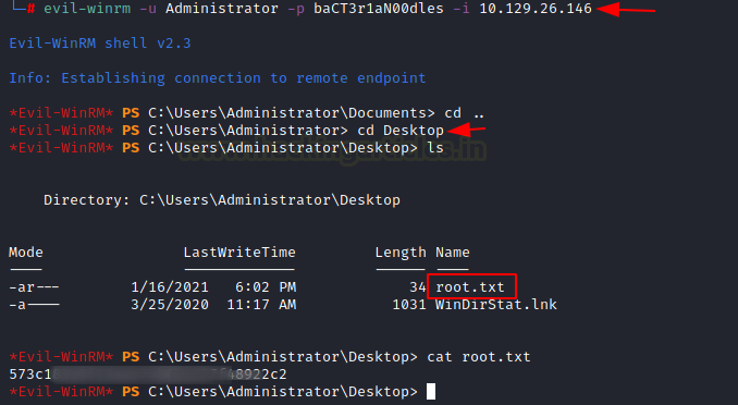 Since we have found login credentials of Administrator. So now by using Evil-WinRM we try to access a remote machine shell of the target machine. As a result, it will give access of victim shell by providing its Powershell as given below. We now enumerate the system, inside “PS C:\Users\ administrator\Documents>” we find a file called “root.txt”. We take a look at the content of the file and find the final flag.