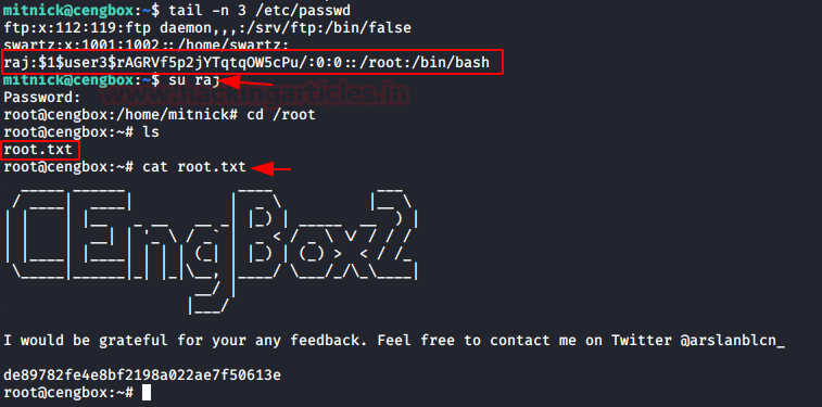 tail -n 3 /etc/passwd su raj cd /root cat root.txt