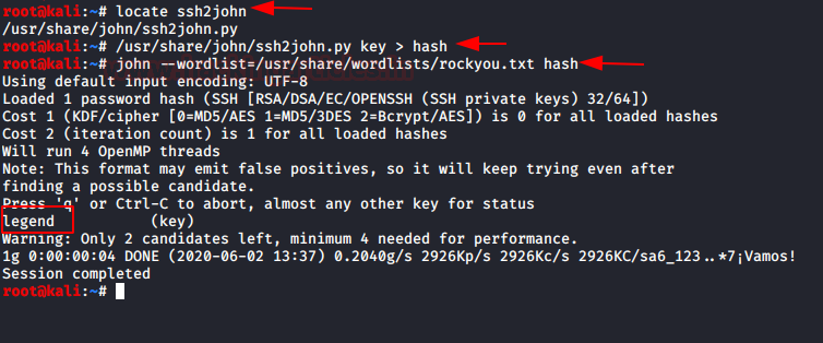 We have a script that can convert the “key” into a crackable hash. It is called ssh2john. It is already in the Kali Linux in the /usr/share/ directory. Using the script we converted the “key” into “hash” file. Now that we have a hash, we used John the Ripper to crack it and discovered that the password is legend.