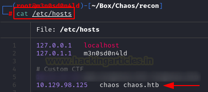 Then, we insert name domains “chaos” and “chaos.htb” in the “/etc/hosts” file. We do this because it is very likely that they use virtual hosting on the machine.