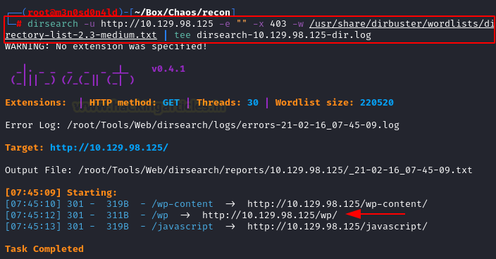 Then, we revise the web site in “chaos.htb“, but not found the information relevant. So we use the dirsearch tool with IP address. Is very import to perform scans in both targets (IP and Host), is possible that virtual hosting uses and we obtains different results.