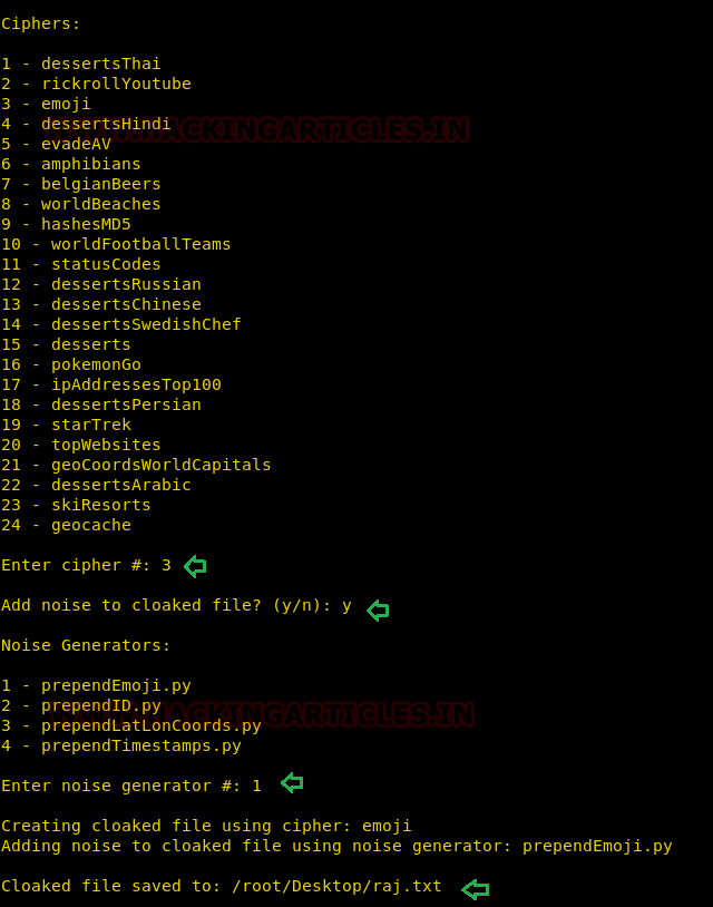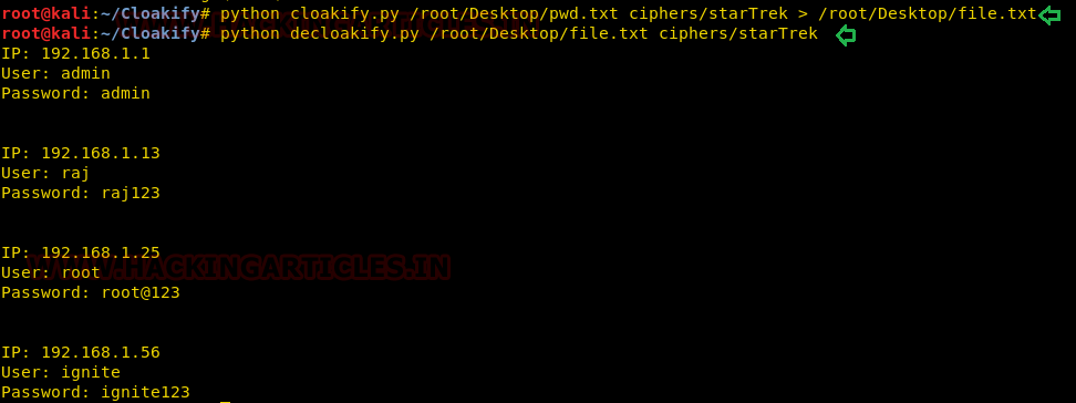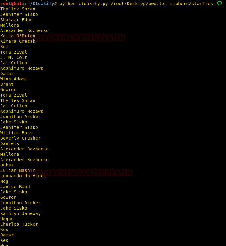 python cloakify.py /root/Desktop/pwd.txt ciphers/starTrek > /root/Desktop/file.txt python decloakify.py /root/Desktop/pwd.txt ciphers/starTrek