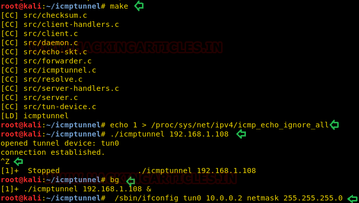 cd icmptunnel make echo 1 > /proc/sys/net/ipv4/icmp_echo_ignore_all ./icmptunnel 192.168.1.108 ctrl z /sbin/ifconfig tun0 10.0.0.2 netmask 255.255.255.0