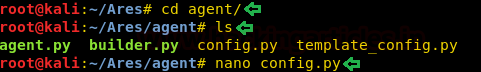 Now that we have successfully installed all the requirements needed to run the Ares tool. Its time to gain the Command and Control Session. To do this we are going to need an agent. For this, we use the cd command to traverse into the agent directory. After that, we list the contents of the file to find a config file. We will be needing to edit the file so as to gain the session.