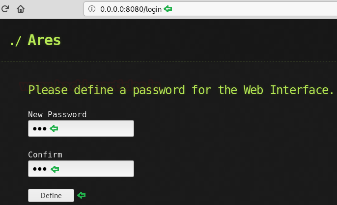 Now we will open the server IP in our browser. Here we will see a form asking for the password as shown in the given image. We entered the password and clicked on Define to continue.