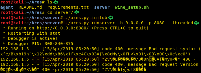 ls cd server/ ./ares.py initdb ./ares.py runserver -h 0.0.0.0 -p 8080 --threaded