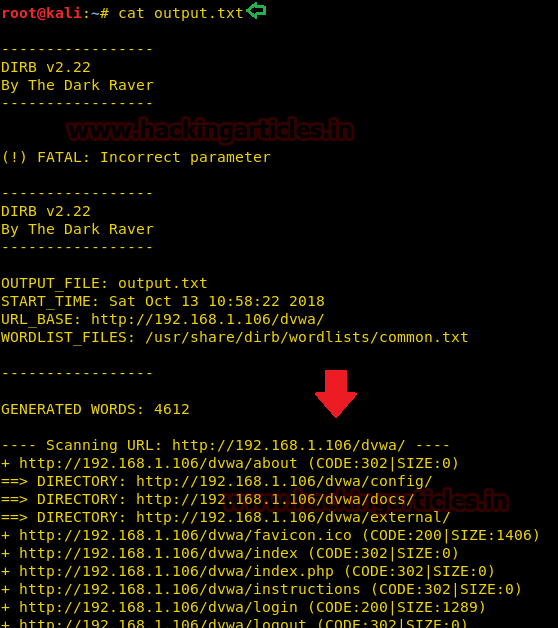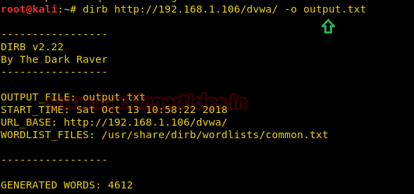dirb http://192.168.1.106/dvwa/ -o output.txt