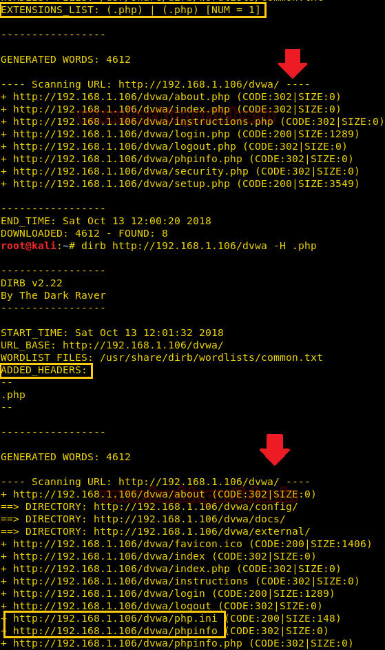 dirb http://192.168.1.106/dvwa -H .php