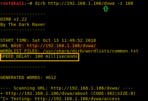 While working in different scenarios, there is some environment we come across that cannot handle the flood created by the dirb scan, so in those environments, it is important that we delay the scan for some time. This can be done easily with the -z parameter of the dirb scan. In this parameter, the time is provided on the scale of milliseconds. Like as shown in our given example, we have given 100 seconds delay to dirb.