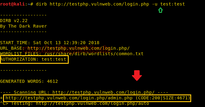 dirb http://testphp.vulnweb.com/login.php -u test:test