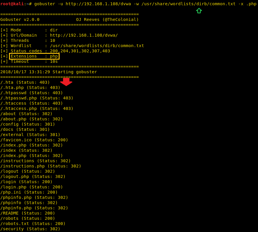 gobuster -u http://192.168.1.108/dvwa -w /usr/share/wordlists/dirb/common.txt -x .php
