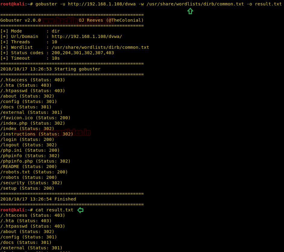 gobuster -u http://192.168.1.108/dvwa -w /usr/share/wordlists/dirb/common.txt -o result.txt