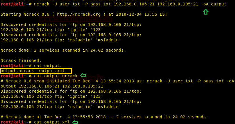 As you can observe that it has stored the result in two formats as “output.ncrack” and “output.xml”.