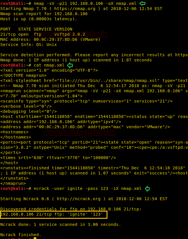 As you can observe that when we try to crack FTP service for the host: 192.168.0.106, it gives ignite:123 as login credential that I had to save in a text file.