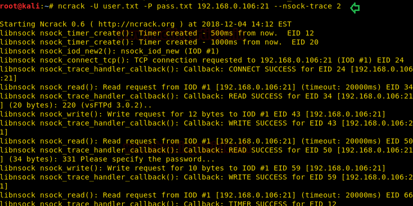 ncrack -U user.txt -P pass.txt 192.168.0.106:21 --nsock-trace 2