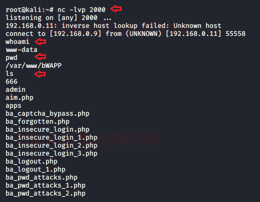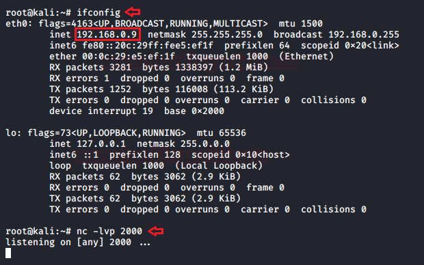 From the below image you can see that I’ve checked my Kali machine’s IP address and set up the netcat listener at port number 2000 using