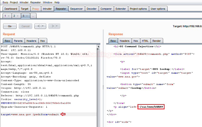 Now I just need to manipulate the target by adding up some system commands i.e. “pwd” with the help of metacharacters.