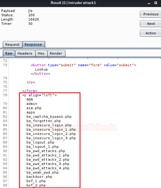 From the below image you can see that the “;” metacharacter did its work, and we are able to list the contents of the directory where the application actually is. Similarly we can run the other system commands such as “;pwd”, “;id” etc.