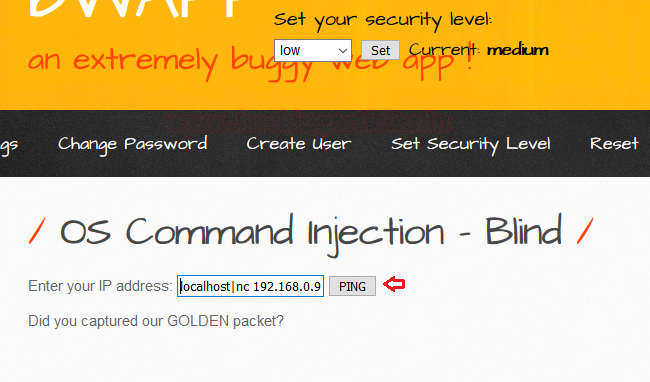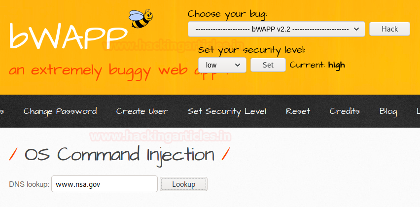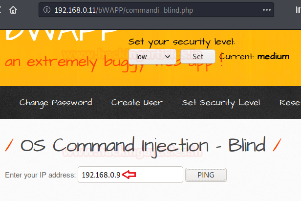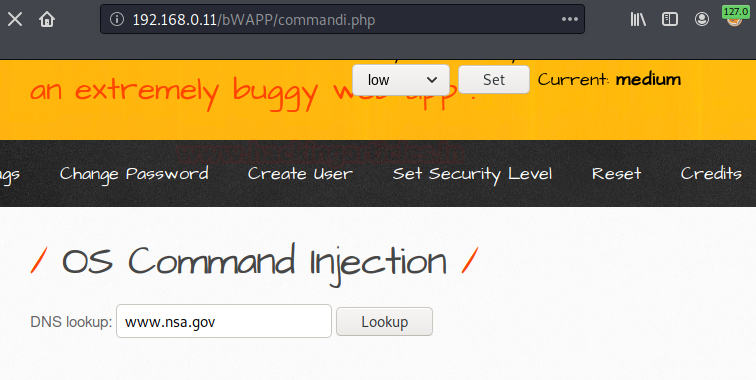 From the below image you can see that I’ve set the security level too high and opted the “Choose your bug” option to “OS Command Injection”.