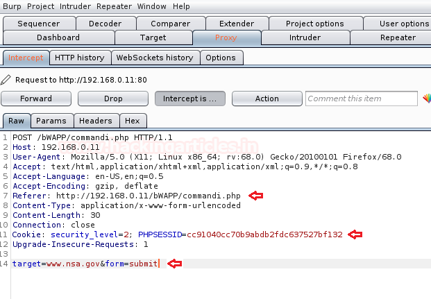 Commix works on cookies. Thus in order to get them, I’ll be capturing the browser’s request into my burpsuite, by simply enabling the proxy and the intercept options, further as I hit up the Lookup button, I’ll be presented with the details into the burpsuite’s Proxy tab.