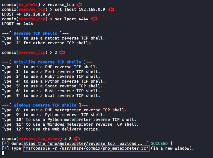 As soon as we capture the commix session, we’ll try to generate a reverse meterpreter session of the target machine by executing the following commands: