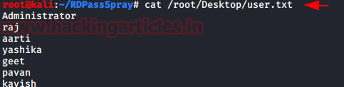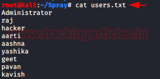 Spray.sh is a pretty famous shell script that is used to spray passwords. Before we go on spraying, let’s create yet another dictionary with usernames as shown in the image below. We will be brute-forcing the SMB users. We will create a similar dictionary with probable passwords. But we will keep the passwords to a maximum of 2 so that it won’t trigger any lockout policies.