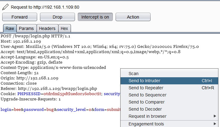 Password Spraying can be applied on the Web Applications as well. To show this I decide to use the BWAPP. It allows us to create the users as we need multiple users for this practical. Now, after creating users, we move to the login page of the BWAPP and enter the credentials and capture the request on BurpSuite. Then right-click on the captured request and send it to Intruder.