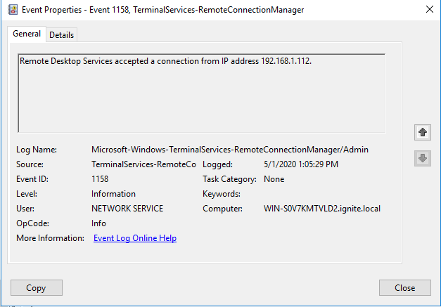 Usually, I keep the logs for the Detection section of my article but this particular log was very specific for this tool. Hence, I wanted to show it. It is for the Event ID 1158. We ran the RDPassSpray and found that it created a log for this event. Here we can see that we have the IP Address of the attacker.