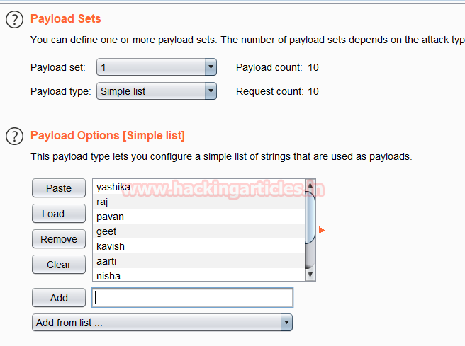 Now onto the Payload tab. Here we will be providing the payload options or the usernames that we are putting in the dictionary in the previous attacks. We can directly paste it from the dictionary or add the usernames one by one by typing them in the dialog box and clicking on the Add button.