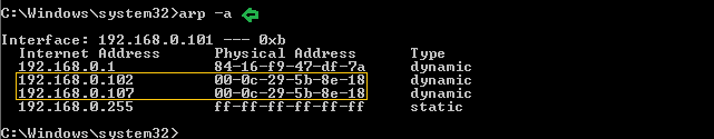 Since we have started the arp poisoning attack on both the victim machine X.X.X.101 and 102 from our Kali machine, if we go to any host and type arp -a on the command prompt, you will clearly see that the physical (MAC) address of the victim machine has changed to the physical (MAC) address of the Kali machine, as shown above, Physical (MAC) address of both the IP X.X.X.102 and X.X.X.107 are same, which means that all the traffic from host X.X.X.102 is passing through Kali machine X.X.X.107