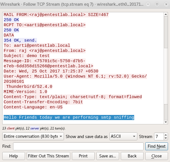 Here target A: raj@pentestlab.local is sender who is sending the message to target B: aarti@pentestlab.local and hence port 25 for SMTP service will get in action.
