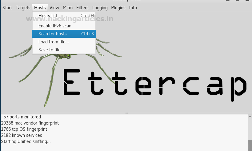 Let us now start to exploit both Host A and Host B, from Host C machine, which is our Kali Linux, start sniffing with Ettercap tool as shown in the below image on Kali.