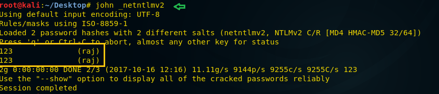 From given below image you can confirm, we have successfully decoded the captured hashes with the user name as raj and password as 123.